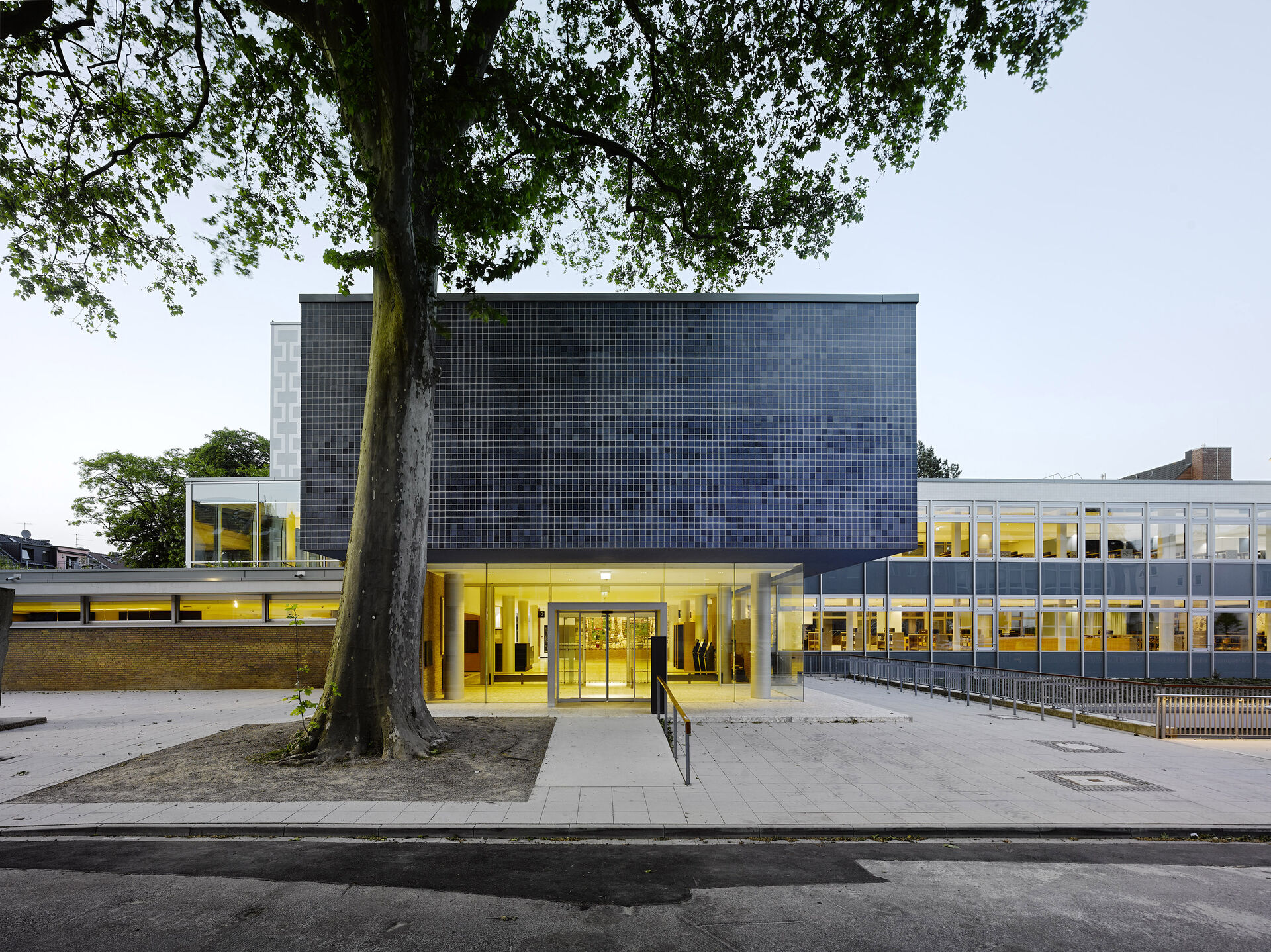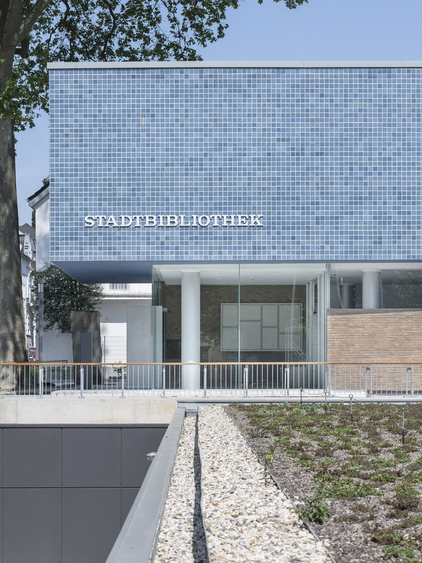 Für die Sanierung der Stadtbibliothek Mönchengladbach stellten wir 14500 Fliesen in unterschiedlichen Blautönen her. Alle Fliesen sind geeignet für den Vollwärmeschutz (frostfest)